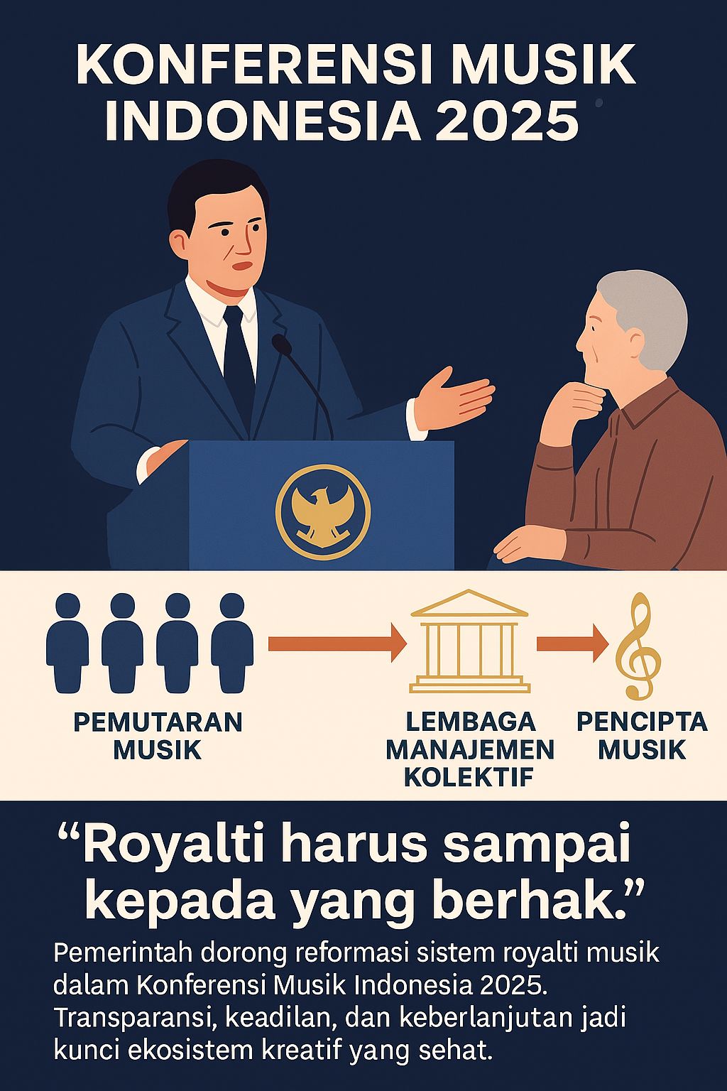Pemerintah Indonesia dorong reformasi sistem royalti musik dalam Konferensi Musik Indonesia 2025. Transparansi, keadilan, dan keberlanjutan jadi kunci ekosistem kreatif yang sehat (Infografis: DRJ/AI).