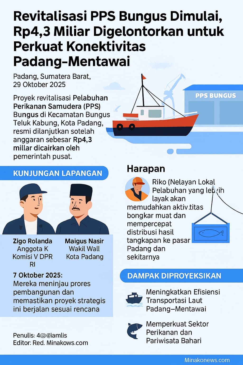 Revitalisasi Pelabuhan Perikanan Samudera (PPS) Bungus di Padang, menampilkan kunjungan lapangan Zigo Rolanda dan Maigus Nasir, harapan nelayan lokal, serta dampak proyek senilai Rp4,3 miliar terhadap konektivitas laut Padang–Mentawai dan pertumbuhan ekonomi maritim (Infografik: 44d1n0/ AI).