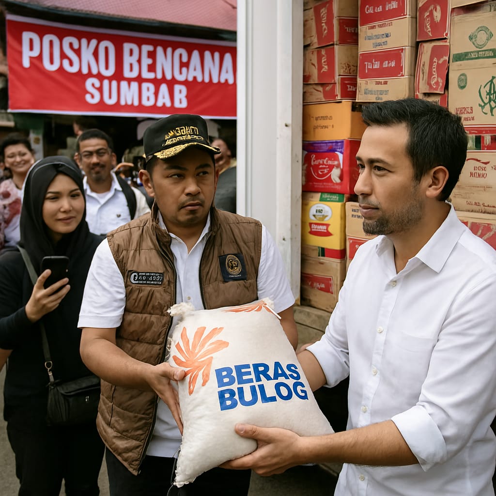 Pejabat daerah menyerahkan beras Bulog di Posko Bencana Sumbar, simbol solidaritas pemulihan pascabencana (Potret Digital: DM).