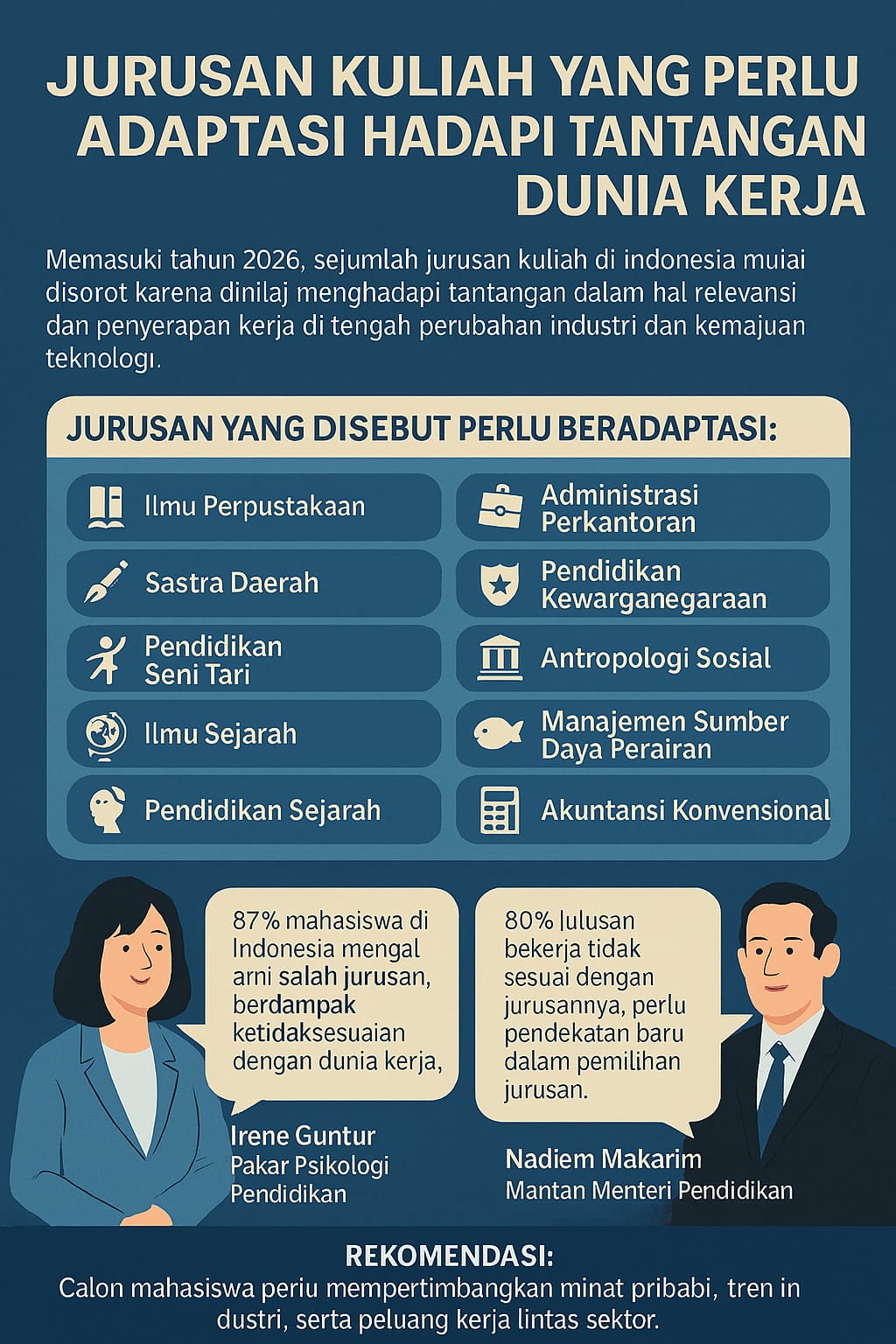 Memasuki tahun 2026, sejumlah jurusan kuliah di Indonesia mulai disorot karena dinilai menghadapi tantangan dalam hal relevansi dan penyerapan kerja. Perubahan cepat dalam dunia industri, kemajuan teknologi, serta meningkatnya peran kecerdasan buatan (AI) menjadi faktor utama yang mendorong perlunya adaptasi sistem pendidikan tinggi.