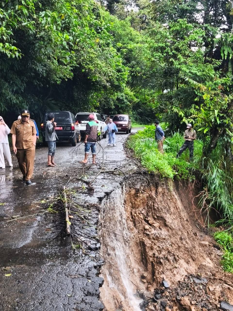 Di Polongan 6, jalan terban akibat hujan ekstrem. Sekda Doddy menegaskan perlunya pemasangan rambu peringatan dan pembatasan kapasitas kendaraan karena kondisi jalan masih labil.