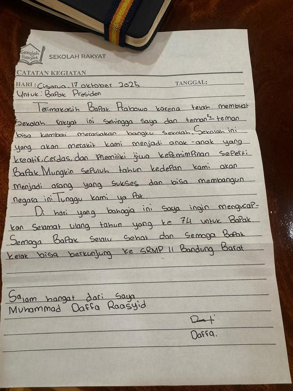 Presiden Republik Indonesia, Prabowo Subianto, menerima sepucuk surat istimewa dari seorang siswa Sekolah Rakyat Menengah Pertama (SRMP) II Bandung Barat, Muhammad Daffa Raasyid. Surat tersebut ditulis tangan dan disampaikan melalui Sekretaris Kabinet, Teddy Indra Wijaya, bertepatan dengan hari ulang tahun Presiden pada 17 Oktober lalu.
