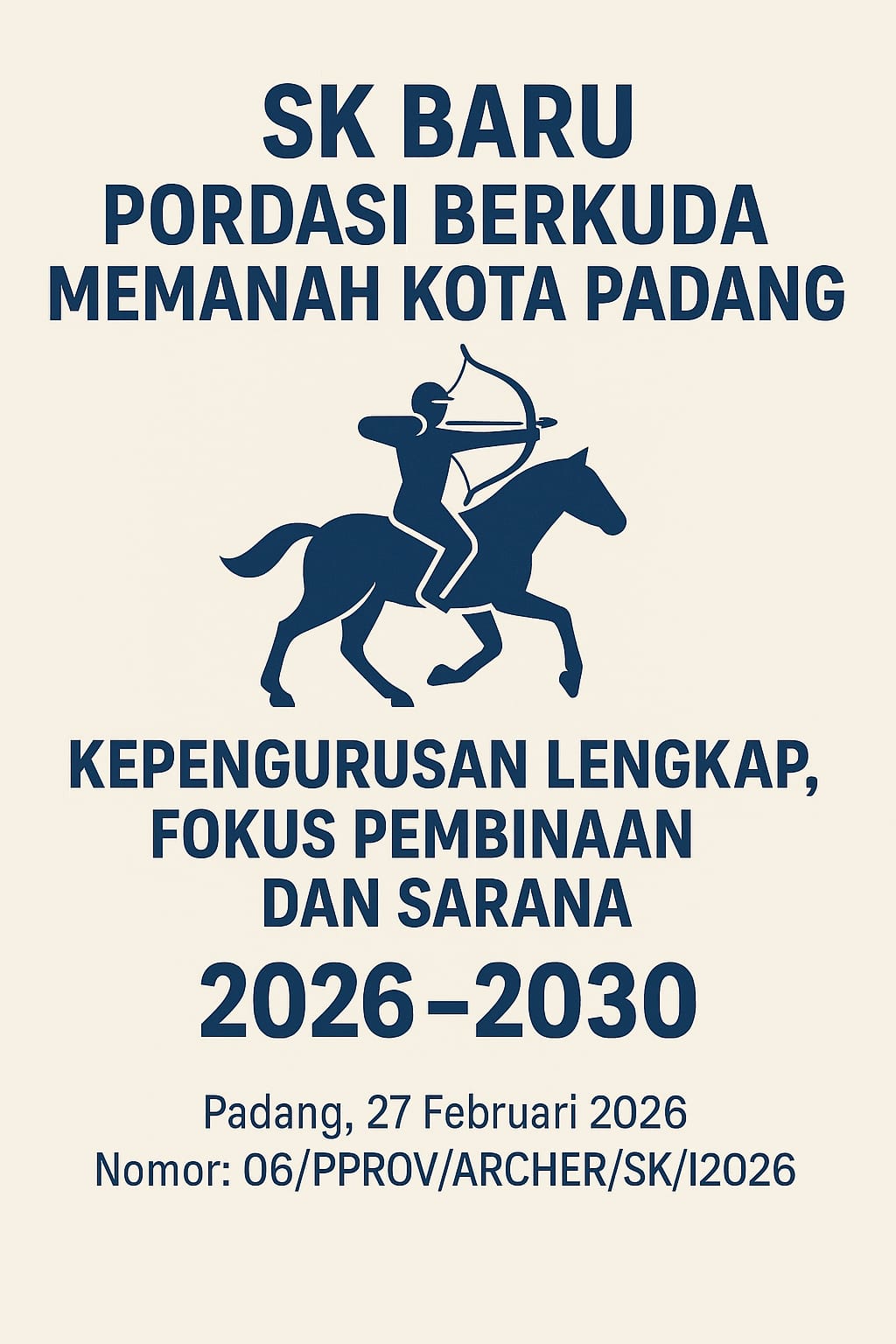 Padang (Sumbar). MINAKONEWS. Kepengurusan baru Pengkot PORDASI Berkuda Memanah Kota Padang resmi ditetapkan melalui Surat Keputusan Nomor 06/PPROV/ARCHER/SK/II/2026 yang ditandatangani Ketua Pengprov PORDASI Berkuda Memanah Sumbar, H. Muhidi, MM. SK ini berlaku untuk masa bakti 2026–2030 dan menjadi tonggak penting konsolidasi organisasi pasca Munas XIV PORDASI tahun 2024.