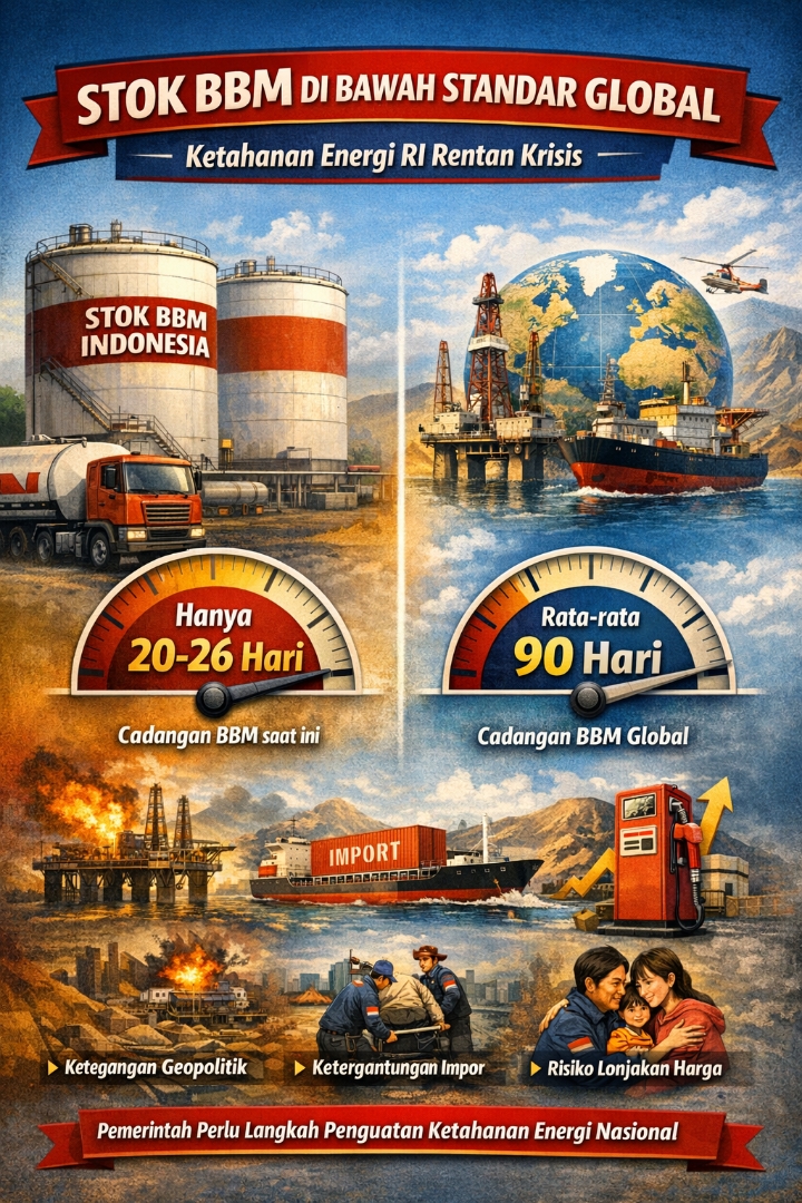 Dengan cadangan yang masih di bawah standar, penguatan ketahanan energi menjadi kebutuhan mendesak agar Indonesia tidak rentan terhadap krisis pasokan maupun lonjakan harga minyak dunia.