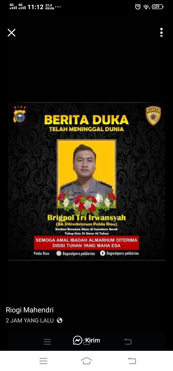 Brigpol Tri Irwansyah, personel Ditresamapta Polda Riau, gugur dalam tugas akibat banjir bandang di Padang Panjang.(Dok. Bagwatpers Polda Riau).