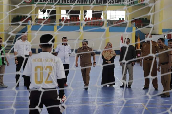 Wawako solok lakukan tendangan pertama Turnamen Futsal UMMY CUP 2023 se – Sumbar di GOR Tanjung Paku . ( Foto : Eli )