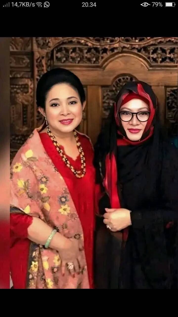 Keduanya tampil anggun dengan busana yang mencerminkan karakter masing-masing. Mbak Tutut mengenakan busana hitam elegan berpadu dengan kerudung merah-hitam yang dililit rapi, memberi kesan tegas sekaligus berwibawa. Kacamata yang ia kenakan menambah aura intelektual, sementara tata rias wajahnya sederhana namun menonjolkan ketegasan mata.