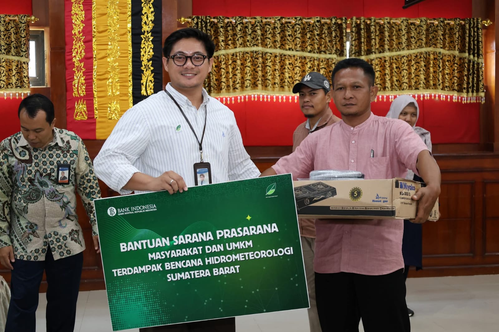 Bank Indonesia bersama Kementerian UMKM RI menyerahkan bantuan sarana prasarana dan program trauma healing bagi UMKM terdampak bencana hidrometeorologi di Kota Pariaman.(Foto Dok. MCK).