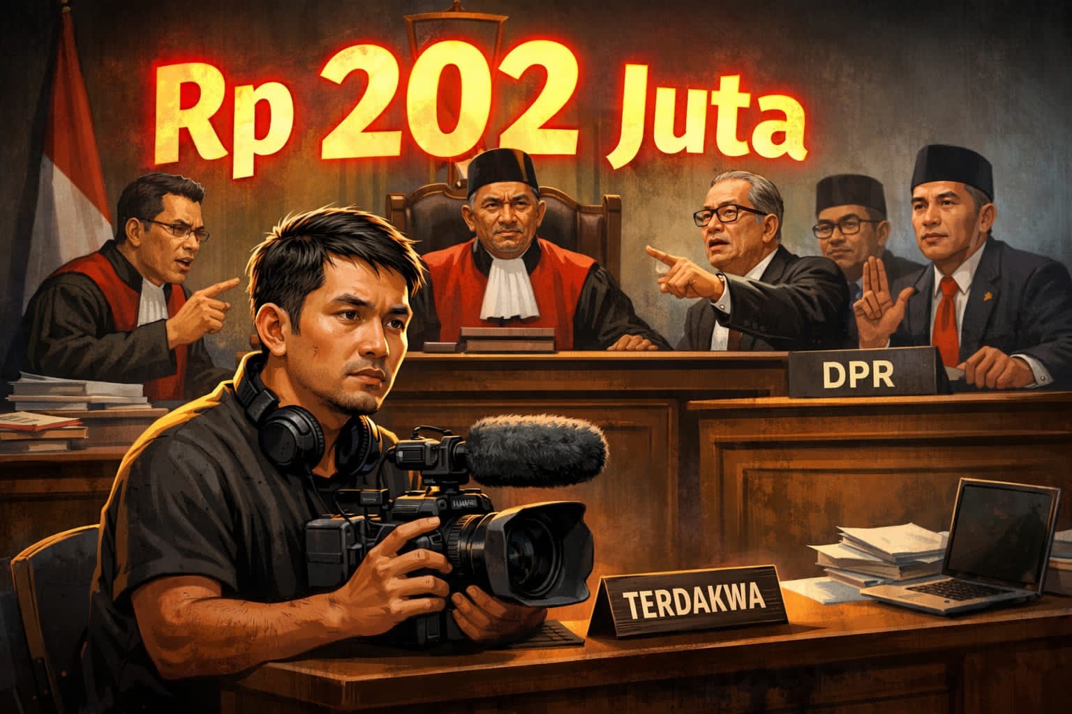 Videografer Amsal Sitepu duduk sebagai terdakwa dalam kasus dugaan kerugian negara Rp202 juta. (Ilustrasi: Minakonews/AI).