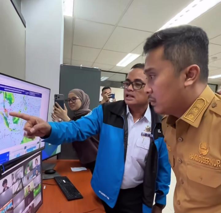 Wagub Sumbar Vasko Ruseimy meninjau koordinasi cuaca ekstrem di posko pemantauan, pastikan keselamatan warga jadi prioritas. (Foto Dok. Ist).