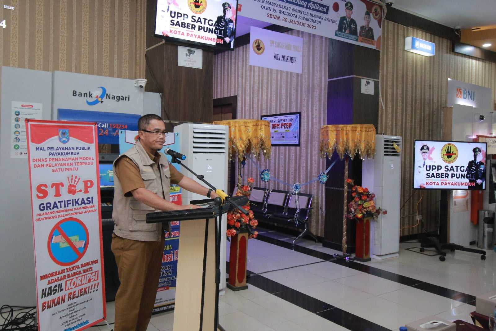 Payakumbuh (SUMBAR) MINAKONEWS.COM- Peresmian Posko Unit Pemberantasan Pungutan (UPP) Sapu Bersih Pungutan Liar (Saber Pungli) sekaligus launching aplikasi pengaduan masyarakat Whistle Blower Sistem (WBS) dilaksanakan di MPP Kota Payakumbuh, Senin (30/1).