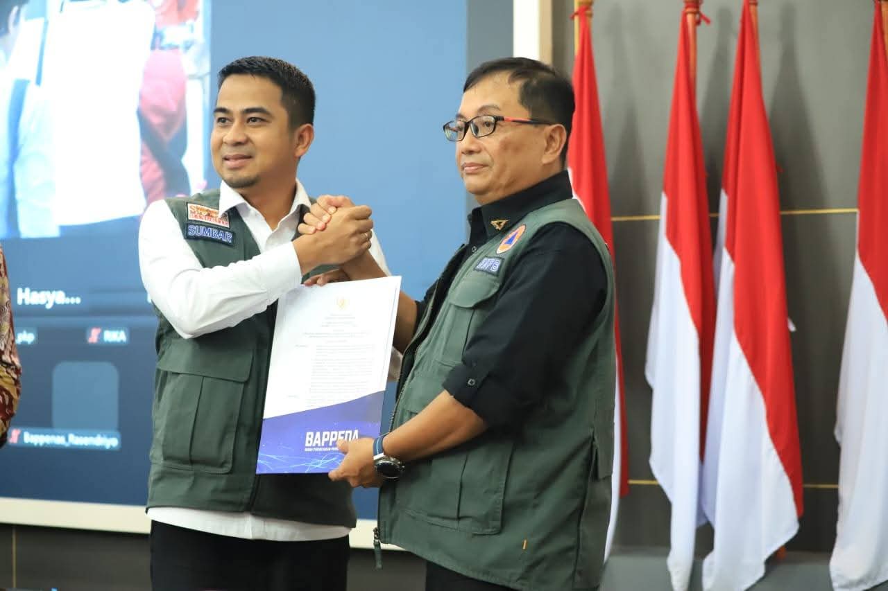 Wali Kota Solok, Dr.H.Ramadhani Kirana Putra dan Wakil Wali Kota Solok, H.Suryadi Nurdal menyerahkan dokumen Rencana Induk dan Rencana Rehabilitasi dan Rekonstruksi Pascabencana (R3P) Kota Solok kepada Sekretaris Utama Badan Nasional Penanggulangan Bencana (BNPB), Rustian, S.Si., Apt., M.Kes, di Auditorium Gubernuran Provinsi Sumatera Barat, Kamis (08/01).(Foto : Eli)