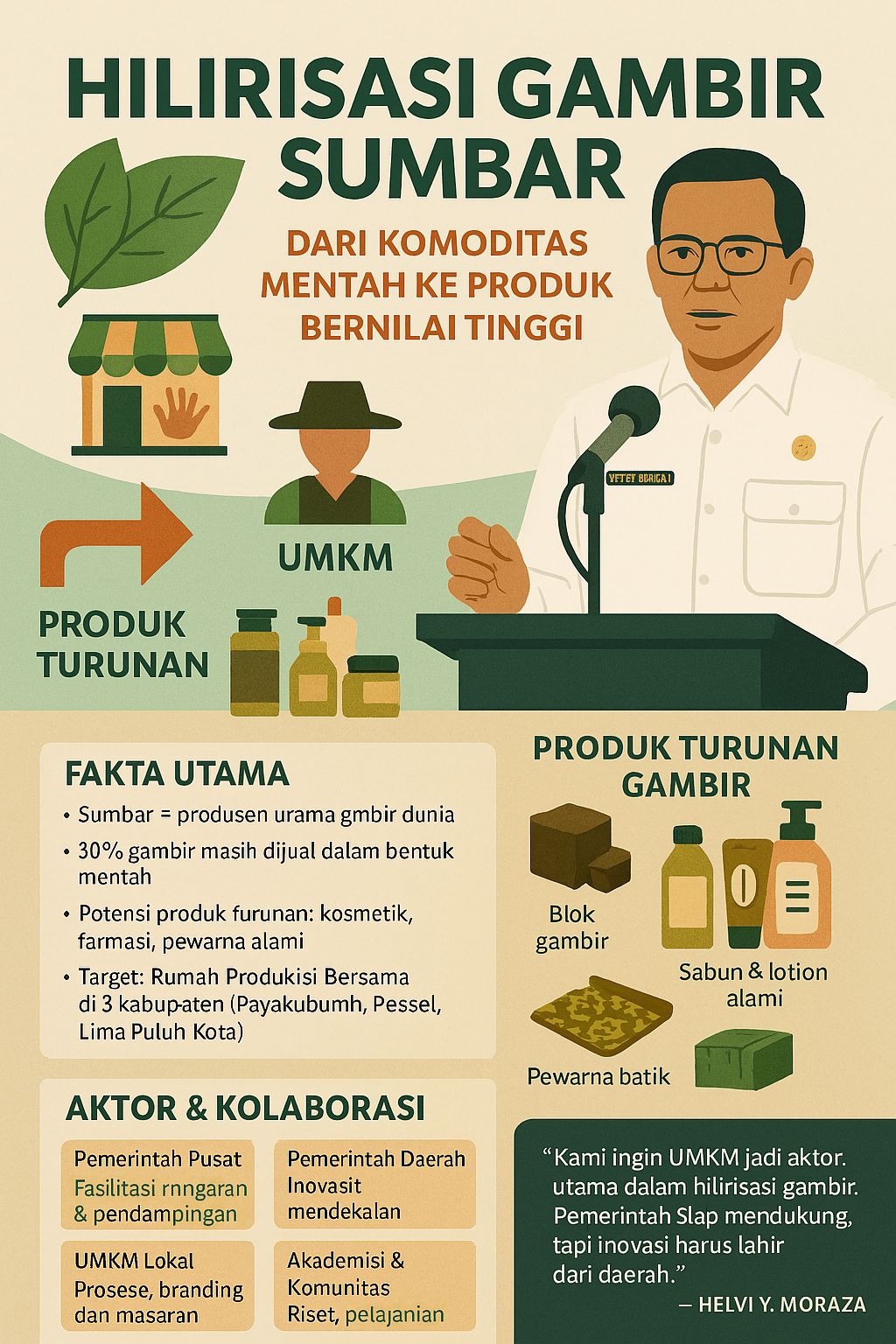 Upaya hilirisasi ini akan diintegrasikan dalam konsep Rumah Produksi Bersama (RPB), yang memungkinkan pelaku UMKM lokal mengolah gambir menjadi bahan farmasi, kosmetik herbal, pewarna alami, dan produk ekspor lainnya. “Gambir adalah komoditas unggulan. Tapi keberhasilan pengembangannya butuh kontribusi aktif dari pemerintah daerah dan pelaku usaha lokal,” ujar Helvi.