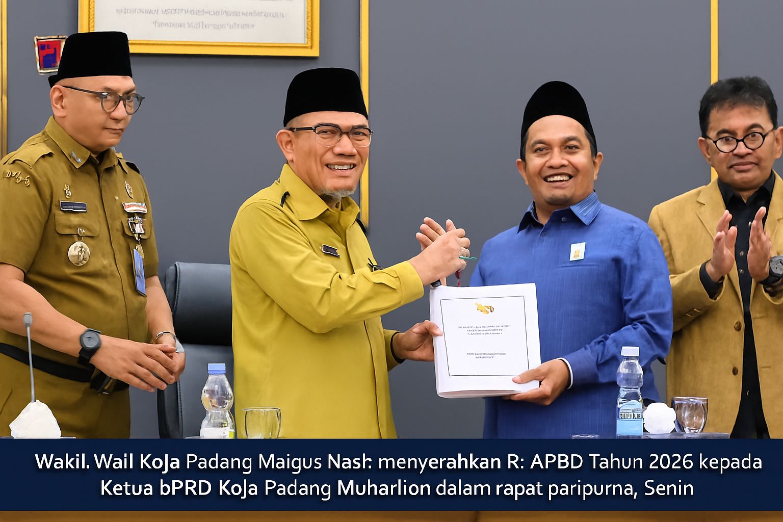 Wakil Wali Kota Padang, Maigus Nasir, menyerahkan R-APBD Tahun Anggaran 2026 kepada Ketua DPRD Kota Padang, Muharlion,(Foto Dok. AI).
