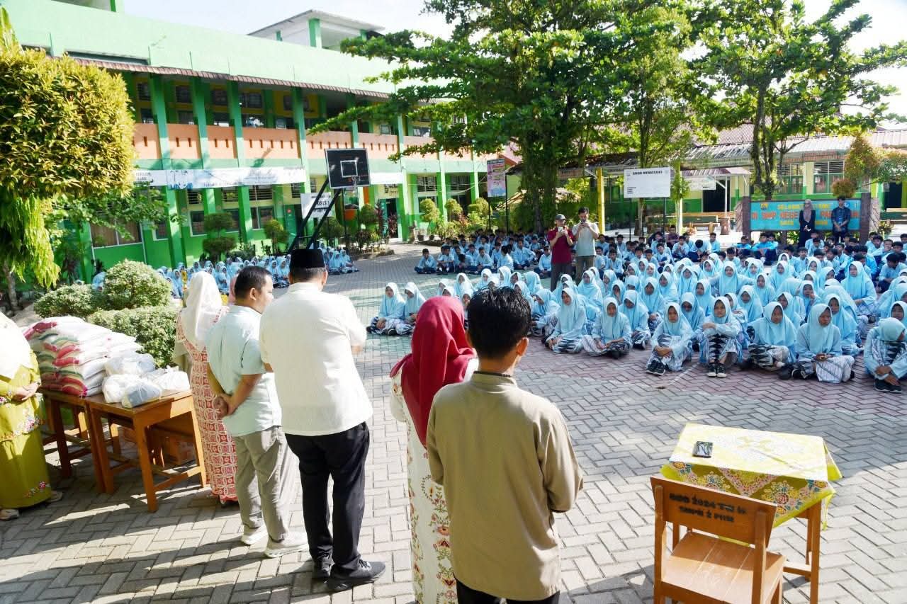 Wali Kota Pariaman Yota Balad menyerahkan bantuan paket sembako kepada siswa-siswi kurang mampu sekaligus menutup secara resmi kegiatan Pesantren Ramadhan 1447 H di SMP Negeri 2 Pariaman, Desa Kampung Baru, Kecamatan Pariaman Tengah, Jumat (13/03/2026).